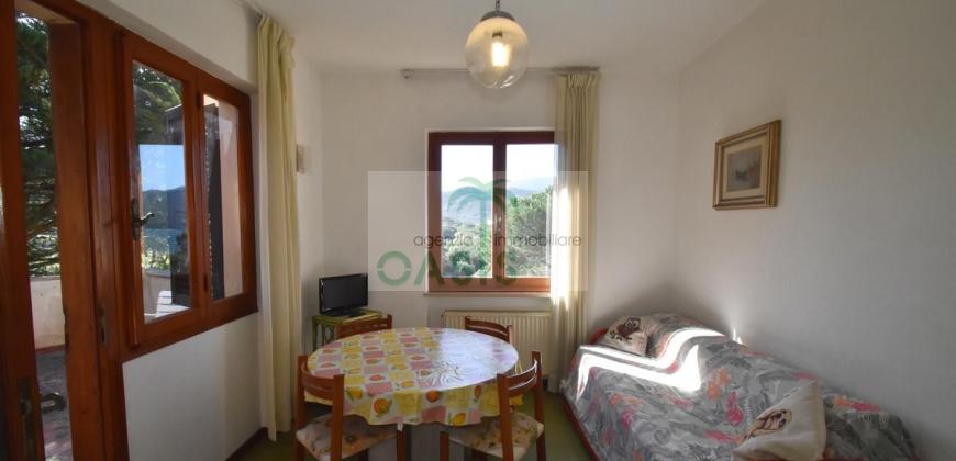 Comodo appartamento trilocale posto a piano terra/rialzato con terrazza panoramica coperta, composto da soggiorno con divano letto doppio estraibile (n.2 singoli), cucinotto, camera matrimoniale, camera doppia (n.2 singoli eventualmente affiancabili), bagno con doccia finestrato e completo di tutti i sanitari. (Blocco A)