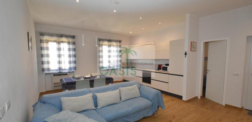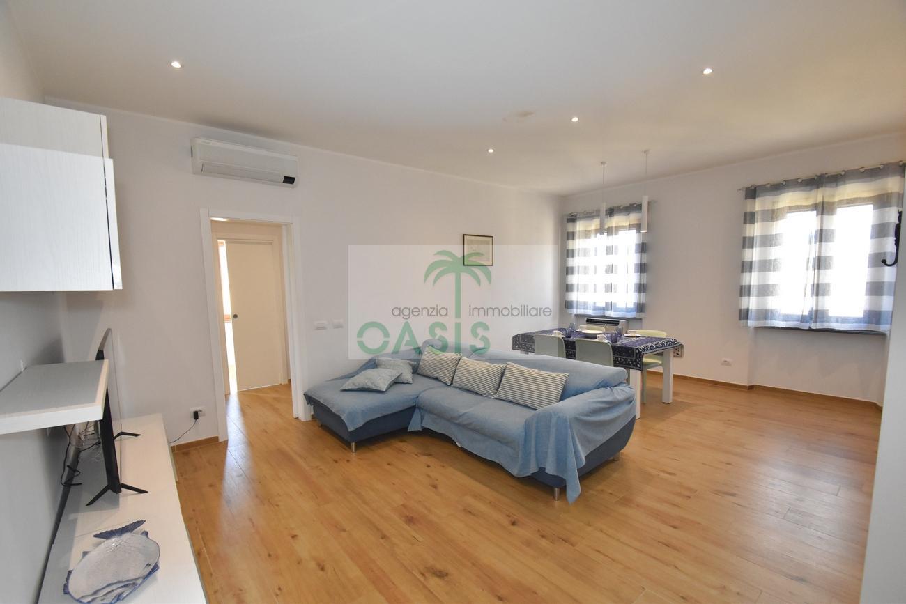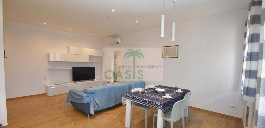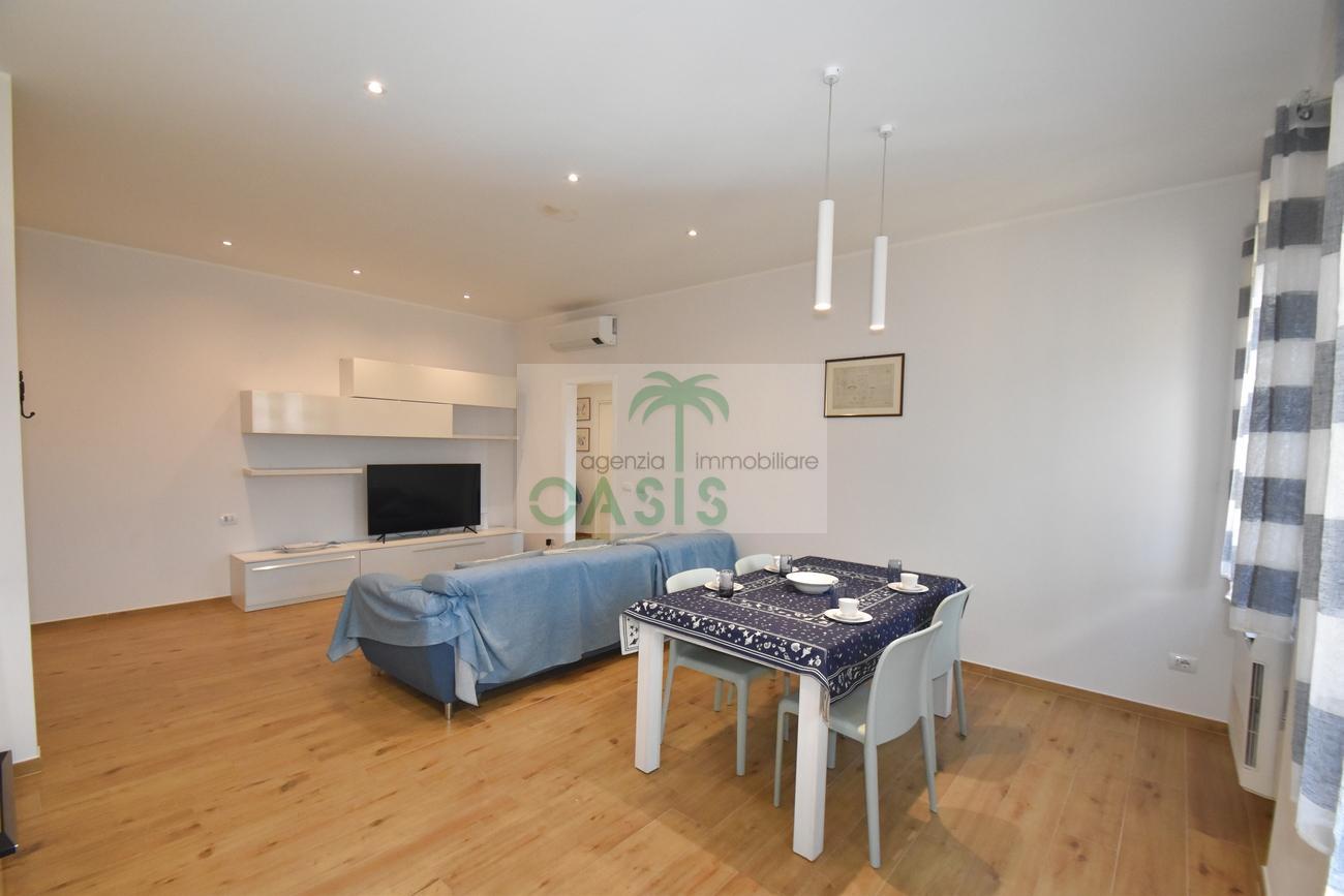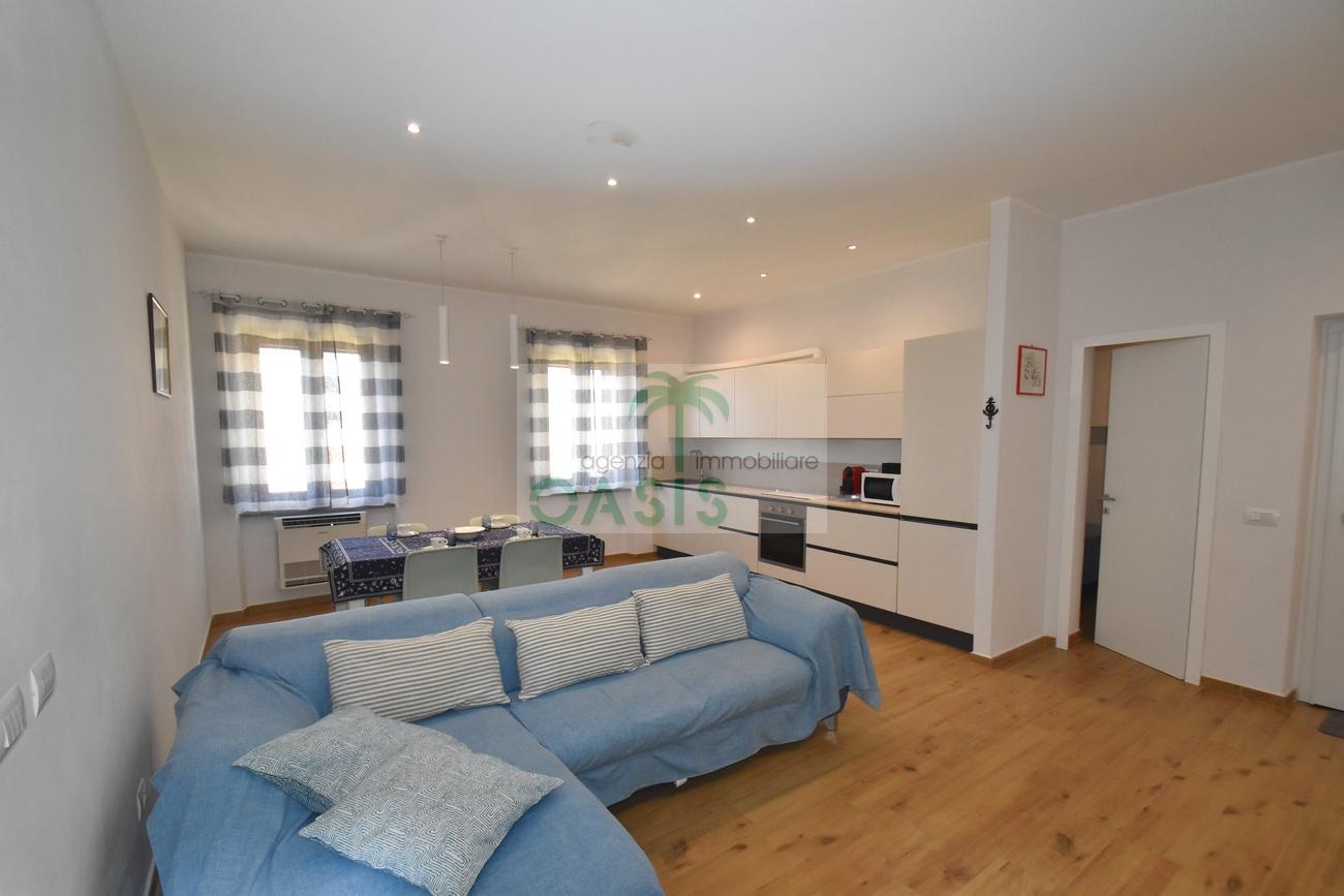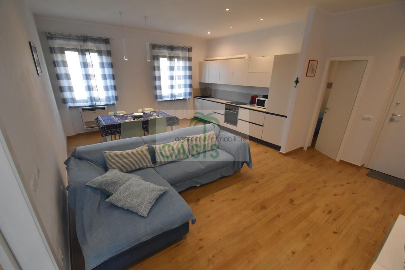 Centrale e vicinissimo al mare! Curatissimo appartamento trilocale con aria condizionata, recentemente e finemente ristrutturato, posto al 2° piano di piccolo complesso nel cuore della zona pedonale, a due passi dalla spiaggia. Composto da ampio e luminoso soggiorno con angolo cottura (piano a induzione, forno, lavastoviglie, frigo/freezer, microonde, tv), spaziosa camera matrimoniale con 2° tv led. (climatizzata), cameretta singola (n.1 letto), bagno finestrato, dotato di box doccia e completo di tutti i sanitari.