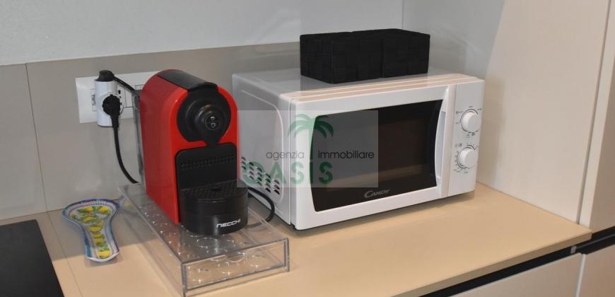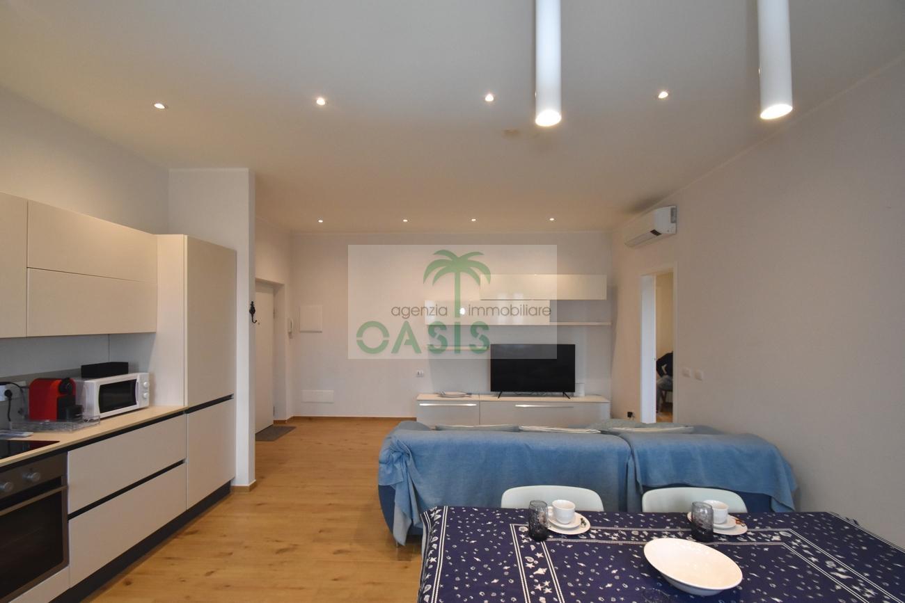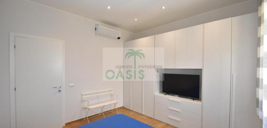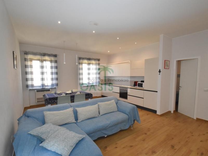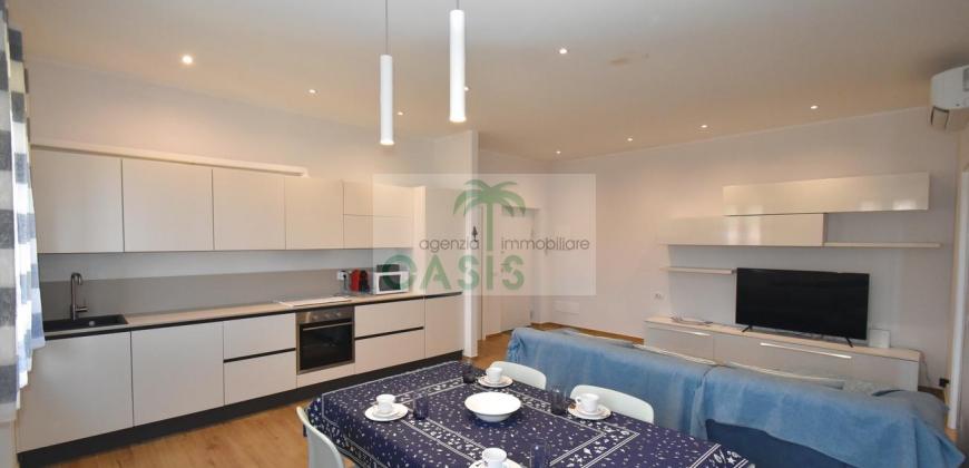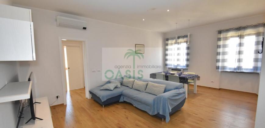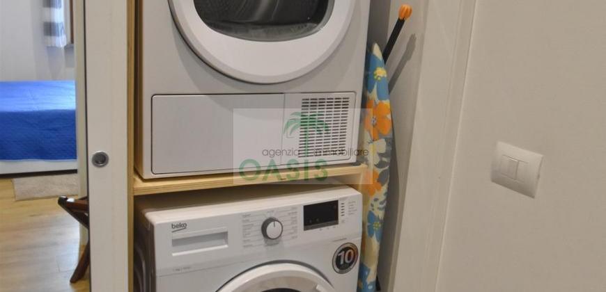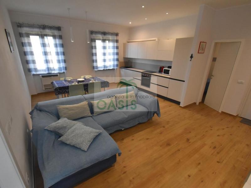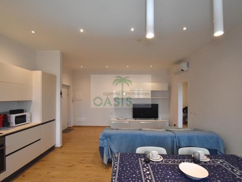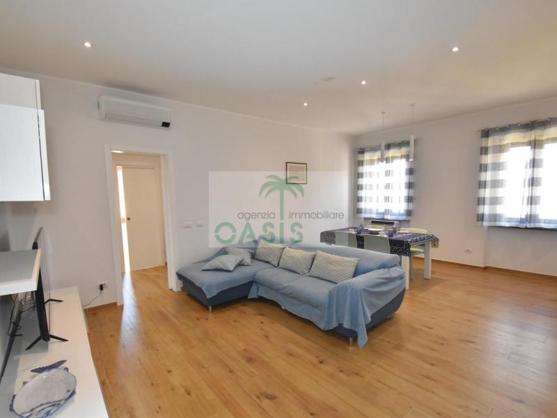 Centrale e vicinissimo al mare! Curatissimo appartamento trilocale con aria condizionata, recentemente e finemente ristrutturato, posto al 2° piano di piccolo complesso nel cuore della zona pedonale, a due passi dalla spiaggia. Composto da ampio e luminoso soggiorno con angolo cottura (piano a induzione, forno, lavastoviglie, frigo/freezer, microonde, tv), spaziosa camera matrimoniale con 2° tv led. (climatizzata), cameretta singola (n.1 letto), bagno finestrato, dotato di box doccia e completo di tutti i sanitari.