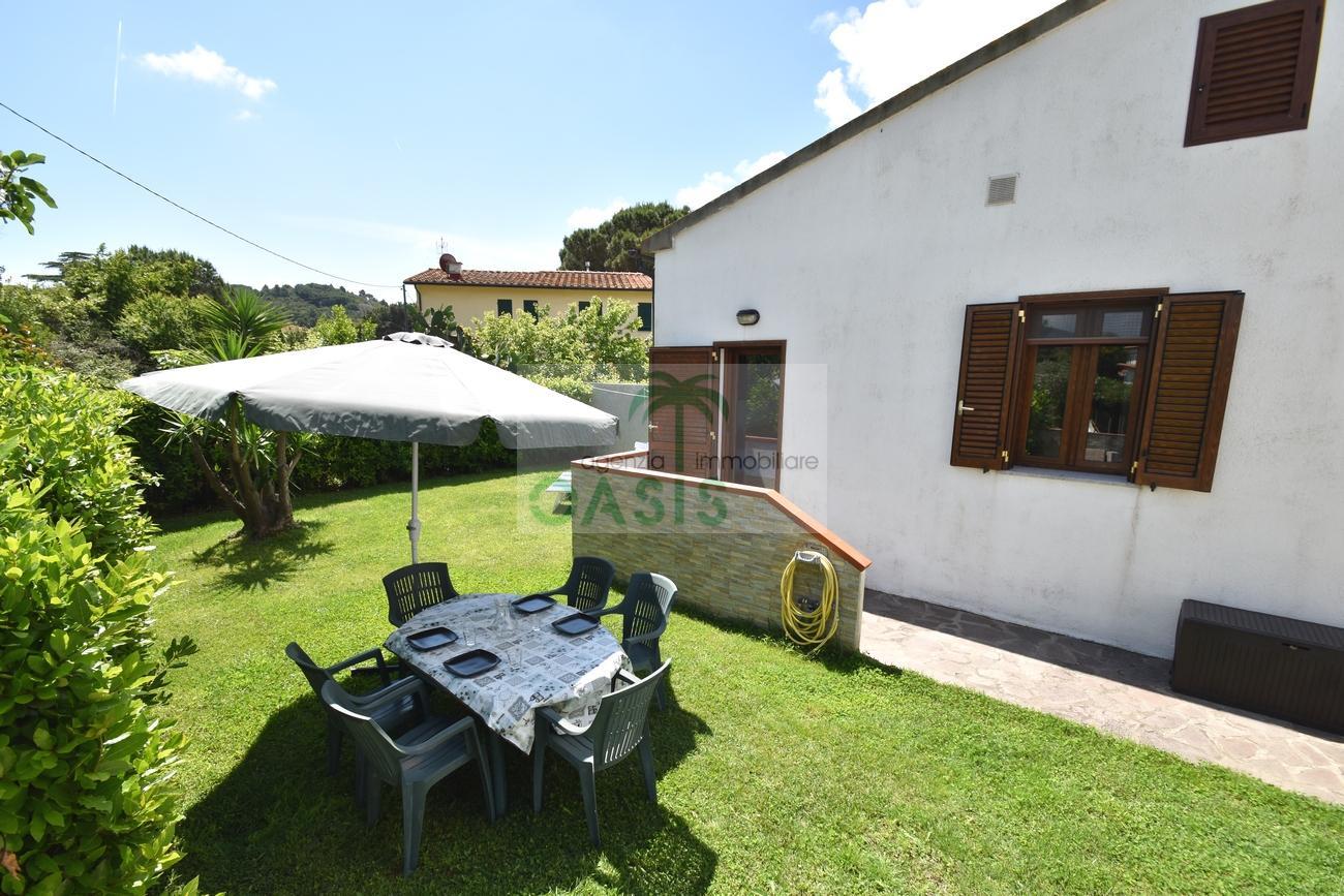 In prossimità del mare e del centro, in zona tranquilla con giardino privato - Trilocale climatizzato posto a piano terra in complesso bifamiliare, composto da soggiorno, cucinotto, camera matrimoniale, camera doppia, bagno con doccia e completo di tutti i sanitari e posto auto privato. Dall'appartamento è possibile raggiungere il centro e la bellissima spiaggia in sabbia, senza utilizziare l'auto.
