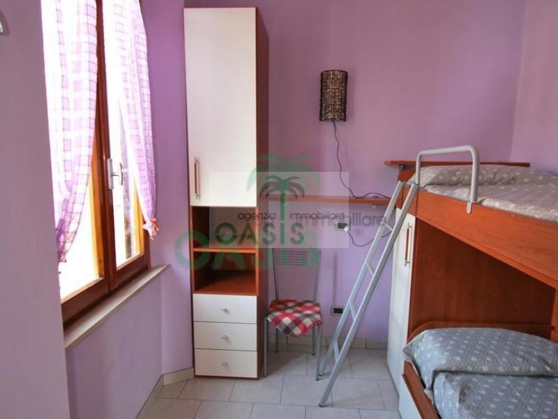 A pochi passi dalla rinomata spiaggia e dal centro paese, comodo a tutti i servizi presenti nella vivace località turistica, grazioso appartamento trilocale con ingresso indipendente, posto al piano primo e composto da : soggiorno (climatizzato) con angolo cottura e divano letto singolo, bagno con box doccia, camera matrimoniale più letto a castello, cameretta doppia ( letto a castello), veranda esterna attrezzata.
