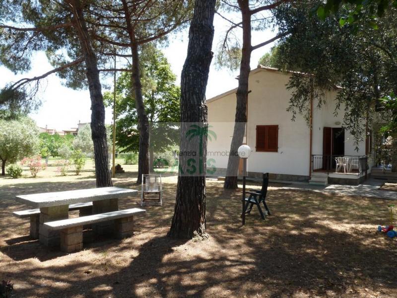 Immersa nel verde di una pineta interamente recintata, in prossimità del centro e della spiaggia in sabbia, villetta indipendente facente parte di un'area di circa 5000 mq, con n.3 villette che condividono in comune l'intera area esterna. Internamente composta da: soggiorno con letto singolo, tre camere da letto matrimoniali di cui una con terzo letto singolo, bagno con doccia, cucina, veranda attrezzata e giardino con secondo bagno esterno. Posti auto. A Km 2,0 dalla spiaggia di Marina di Campo.